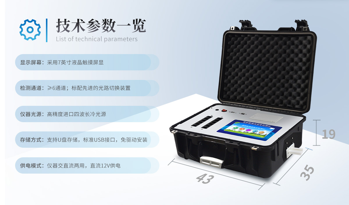 | 主控芯片采用ARM Cortex-A7,RK3288/4核處理器,主頻1.88Ghz,運轉(zhuǎn)速度更快速,穩(wěn)定性更強。 | 顯示方式:7英寸液晶觸摸屏顯示,人性化中文操作界面,讀數(shù)直觀、簡單。 | 交直流兩用,直流12V供電,可連接車載電源,可配6ah大容量充電鋰電池,方便戶外流動測試。 | 四波長冷光源,6個檢測通道,每個通道均配置410、520、590、630nm波長光源,標(biāo)配**的光路切換裝置,專業(yè)光路切換功能可實現(xiàn)*多64波長,并且所有檢測項目可實現(xiàn)所有通道同時檢測。 | 智能恒流穩(wěn)壓,光強自動調(diào)節(jié)與校準,長時間連續(xù)工作光源無溫漂現(xiàn)象。 | 內(nèi)置新國家限量標(biāo)準,與所測結(jié)果進行現(xiàn)場比對,并持續(xù)更新標(biāo)準。 | 不間斷進樣,連續(xù)檢測 | 樣本編號自動累加。 | 數(shù)據(jù)無線上傳平臺,并可從平臺導(dǎo)出為Excel表格。 | 檢測結(jié)果存儲容量20萬條 | 同時支持U盤拷貝,標(biāo)準USB接口,免驅(qū)動插拔。 | 檢測項目可擴充,固件可升級 | 儀器尺寸:43×35×19cm, 主機凈重:5.1kg |